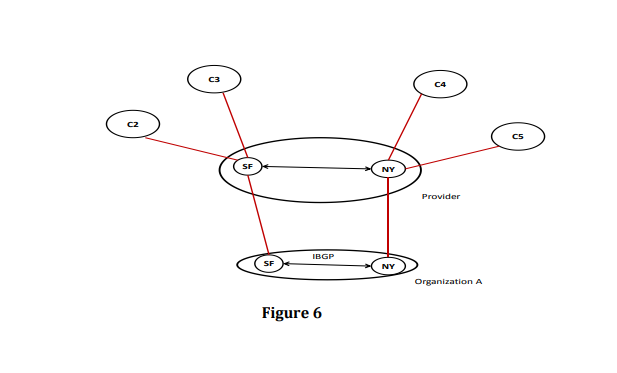 Figure 5 b. [6 marks] Consider a situation in which an Organization A is connected to the provider via two separate routers a shown in the figure below. The organization has the option of deciding which path to take for each of the routes that it accepts from the provider. The organization also has the option to influence inbound traffic. The organization deploys BGP in order to interface with its provider. Using BGP show how can the customer achieve the following objectives i. Outbound traffic: Traffic must be forwarded to C2 and C3 on the SF link and to C4 and C5 on the NY link. ii. Inbound traffic: Traffic from C4 and C5 must be received by NY router on the NY link. Traffic from C2 and C3 must be received by SF router on the SF link. iii. Default: For all the other Internet routes not known to the organization default must be taken in the primary and backup default manner. The primary default must be the NY link and the secondary default must be the SF link.