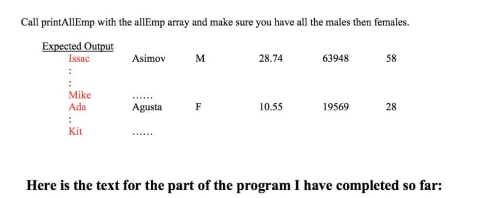 printAllEmp(mAr, male); //call printAllEmp function to print allthe employees in the male array to the screen