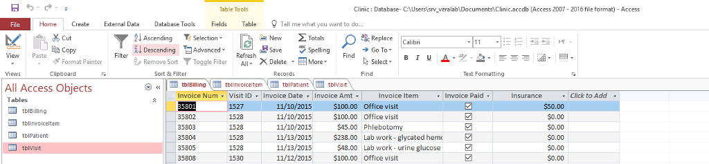 INFS 6330 Project 1 Assignment Week 1-SOL Structured Query Language (SQL) Objective In this project, we are going to use MS Access to practice how to run SQL queries that help transform data into information to support managerial decision making Task You are given a database in a MS Access file called ‘Clinic’ that contains data collected in a physician practice. The physician hired you as a data analyst to answer questions the physician needs answers to in order to help her make business decisions that will help the practice grow. Write the SQL statement for each query and save them in MS Access as Q1, Q2,.. so that the physician can run them at a later time and submit the MS Access file in Blackboard. (to help you answer these questions, you shoud practice running the practice SQL queries shown in the videoes) blInvoiceltem ItemID VisitID Invoiceltem SELECT Parent BirthDate Phone Address City State Zip Reason WalkIn InvoiceAmt InvoiceItemID InvoicePaid WHERE 2 GROUP BY HAVING 4 ORDER BY 6 Query Question SQL Statement 1Show the visit reason, date, and whether it was walkin Show all fields in the visit table List all reasons for visits (no redundancy) List the top 10 visits List the top 5% visits Other Where Clause Operators The comparison operators available in SQL include the six operators (-, <> (not equals). <, <ラ>, >ラIN, LIKE, NOT, BETWEEN, NULL Values), which can be used to compare values in the Where clause. They are used to compare numeric expressions with other numeric expressions and string expressions with other string expressions 6 List all visits taken place after 1/1/2016 List all billings where invoice amounts are more than 100 List lastname, firstname, and city for patients from Windsor city Show all billing columns and sort them by invoice number Show all billing columns and sort them by invoice ascendingly 10amount descendingly and by invoice number Show transcribed image text